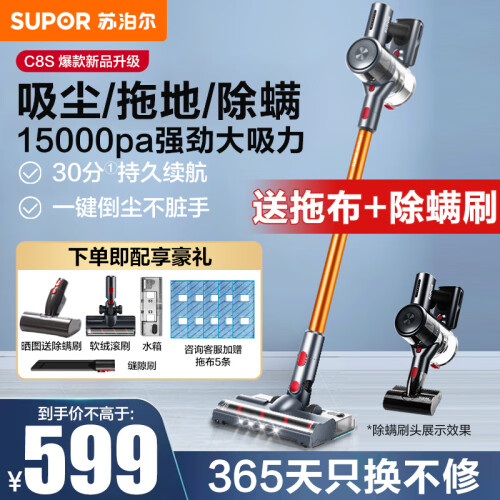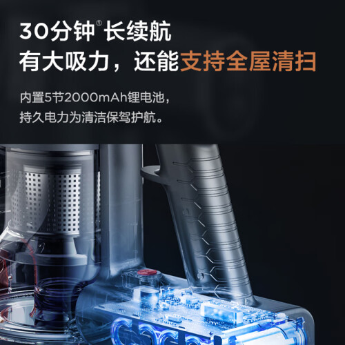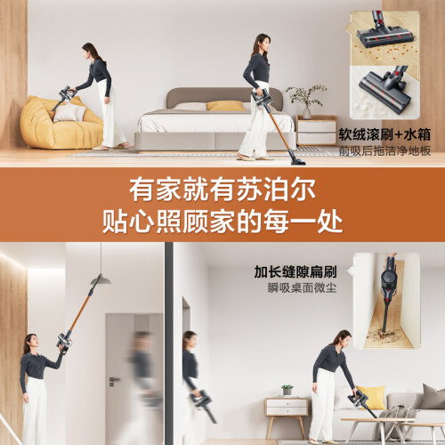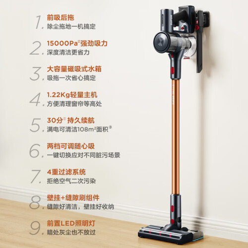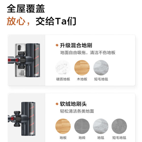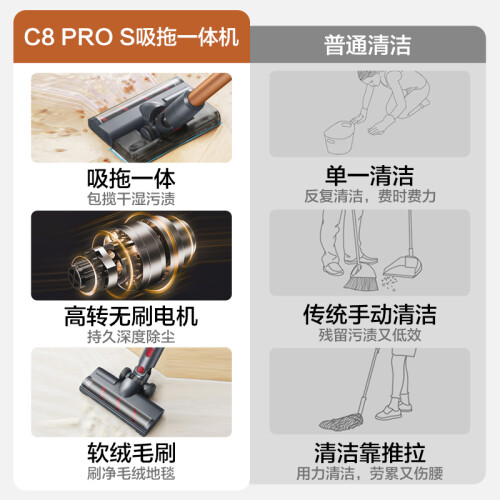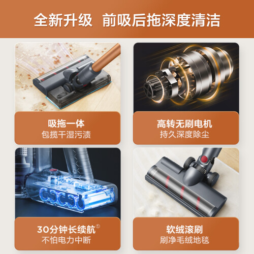 不繁琐,能吸会拖更干净,灰尘和污渍同时包揽,前吸后拖同步进行, 让清洁更简单快速。高转无刷电机 吸力,强得很,15000Pa2飓风大吸力,强悍除尘, 持久畅吸,快速清除地面脏污。