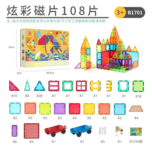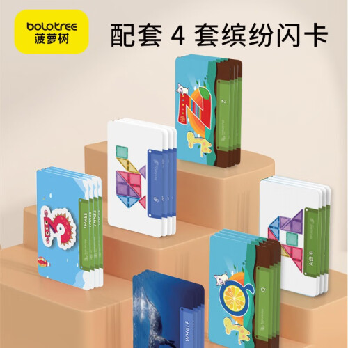 环保塑胶,安全无毒,持久耐用,边角平滑处理,做工精细;色彩鲜丽,提高孩子对颜色的认知。包含108片形状各异的炫彩磁片,216张十三巧板卡片,3只炫彩灯,26张菠萝字母磁贴等可以按说明书的玩法,或自己发挥想象,搭建各式各样的平面或立体造型,发现更多的使用场景和趣味玩法。