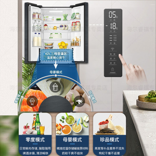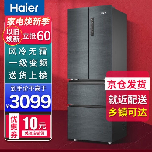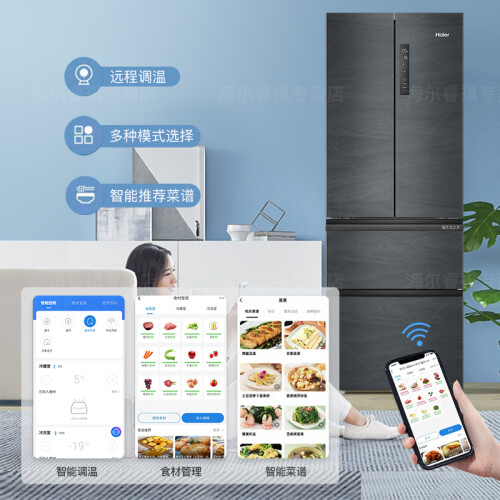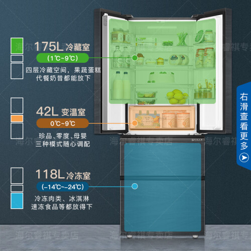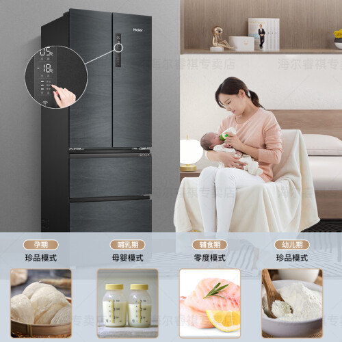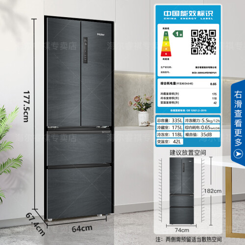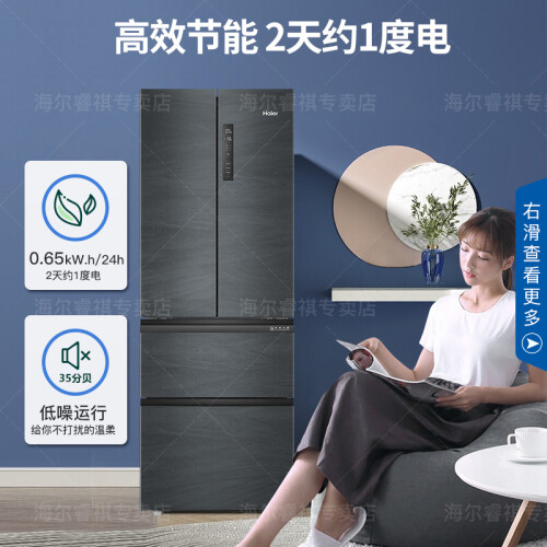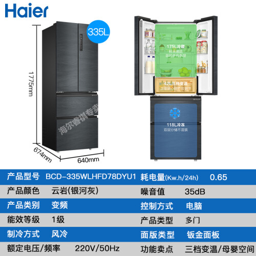 海尔(Haier)这款型号为的BCD-335WLHFD78DYU1的多门冰箱,其采用了时下流行的法式多开门设计,冰箱正面采用了时尚彩晶玻璃面板,冷色调与厨房整体相得益彰。冰箱容积为335升,搭配冷藏、冷冻以及变温的三温区设计,可满足4口之家的日常食物存储需求。 冰箱采用风冷无霜技术,实现360°环抱式出风制冷,有效避免凝结冰霜,告别手动除霜困扰;结核干湿分储设计,果蔬保鲜更多营养美味。
