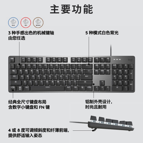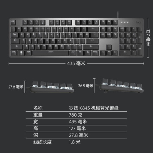 K845机械键盘轴体为CHERRY红轴,线性轴体,手感轻盈,长时间使用别易累。采用优质铝制面板及磨砂工艺,集颜值耐用于一身。悬浮高键帽,弧形布局,打字更舒适。透光模制字符不会褪色或脱落。五种背光灯效,组合多媒体功能键。