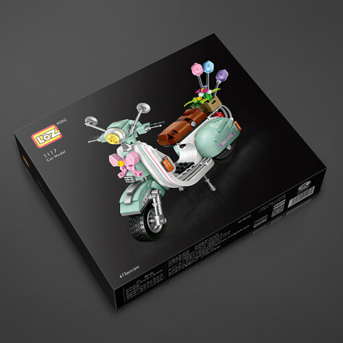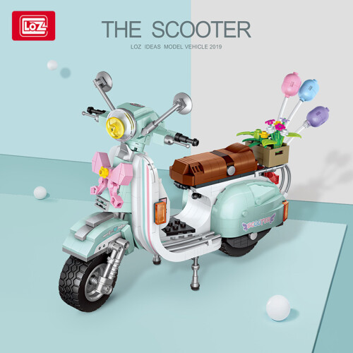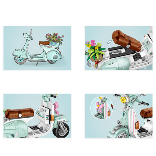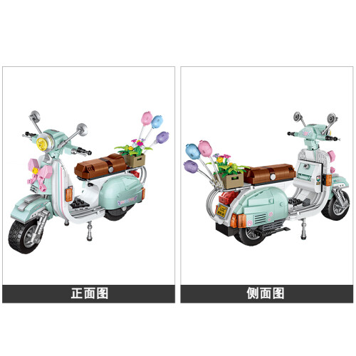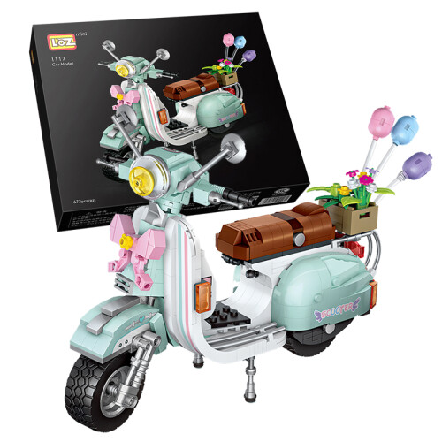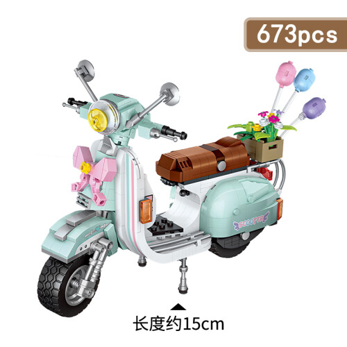 这款仿真小绵羊摩托车,全车拼接起来总计673块颗粒,颜色主色调清新靓丽,车头部位有可爱的粉色蝴蝶结,尾部有盆栽和多色气球装饰。设计合理紧凑,男女孩通吃。尺寸约15*12cm,适合6岁以上的朋友。
