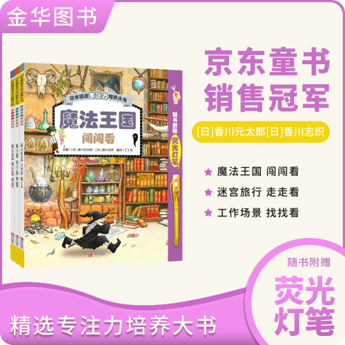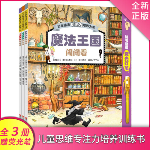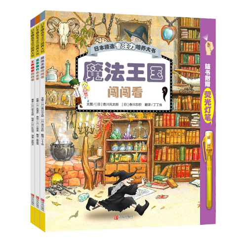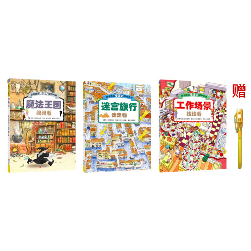 这是一套精选自日本的专注力培养绘本,神奇的荧光魔法绘本 + 环游世界迷宫旅行 + 工作场景认知体验,集知识性、趣味性、互动性于一体的绘本。内容新奇有趣,包含着大量的人文地理知识和职业认知,让孩子边玩边学,轻松提高观察力、专注力、认知力,拓展国际视野。《魔法王国闯闯看》:杰克在森林的入口捡到一根魔杖,只要使用它,就可以帮助魔法王国解除诅咒。用荧光灯笔照亮书页的各个角落,就会发现意想不到的隐藏内容。《迷宫旅行走走看》:万里长城、热带雨林、中央公园、埃及金字塔、大堡礁……作者将12处世界著名旅游目的地制成了手绘迷宫,小朋友们可以一边走迷宫,一边体验世界各地的风土人情。《工作场景找找看》:蛋糕店、花店、宠物店、动物园、机场、海洋乐园……请在这些工作场景里一起玩“找找看”的游戏,享受不同的工作体验。适合5-8岁的孩子。