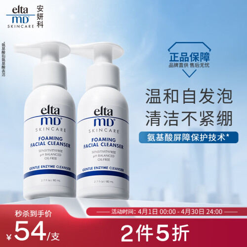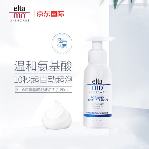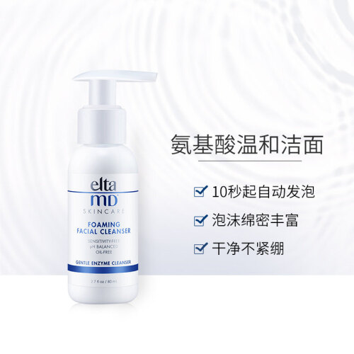 Elta MD氨基酸泡沫洗面奶,不含果酸、添加剂、防腐剂和皂基,弱酸性均衡PH值配方对肌肤无负担。泡沫丰富绵密,不带走皮肤多余的水分,洗后不紧绷、不伤害肌肤皮脂。洁面的同时可以卸妆、防晒霜和隔离霜等。洁净毛孔中的污垢和多余的油脂、温和亲肤,痘痘肌、敏感肌同样适用。