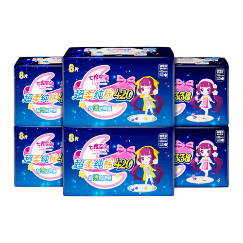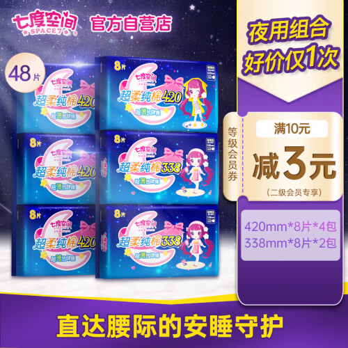 SPACE7 七度空间 少女超薄纯棉 夜用卫生巾无感可护不肤,真芯扇尾不怕漏,直芯双扇尾420mm超长巾身,防侧漏直迷晤际,防后漏,超薄纯棉420有吸收芯,畅吸到底锁住不外漏。
