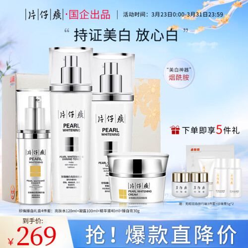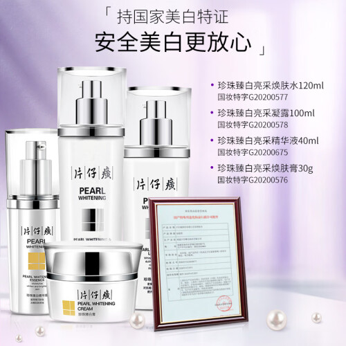 片仔癀(PZH)推出的这款护肤套装,产品中添加烟酰胺、珍珠粉、透明质酸钠和羽衣草、欧锦葵提取物等成分,可改善面部暗沉及淡化色斑,帮助肌肤补水保湿,提亮肤色,令肌肤柔嫩细滑。套装内含精华水、亮肤水和珍珠膏等产品,可根据个人需求选择不同组合套装使用。
