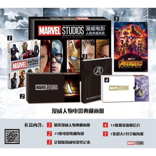 《漫威电影人物典藏画册》礼盒内含180页精装《漫威电影人物典藏画册》1册、漫威电影主题笔记本1册、电影海报20张和精美英雄明信片10张,是值得所有漫威粉丝珍藏的漫威电影宇宙人物全集合。
