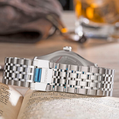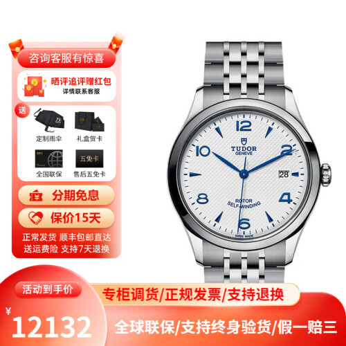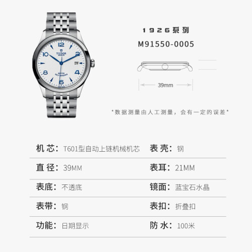 此款产品为TUDOR 帝舵 1926系列 男士机械表 M91550-0005,此款手表的公价为14600元,表盘浮雕饰纹设计搭配阿拉伯数字刻度、剑形指针,经典复古,隽永优雅。多面箭头形或镶钻钟点标记之间镶嵌,偶数阿拉伯数字丰富表盘细节。备表壳采用精钢材质,经过抛光与磨砂,两种工艺处理线条流畅,质感出众。表链是七排式不锈钢链节搭配一枚安全折叠扣,柔顺自然,手感出色,佩戴舒适。
