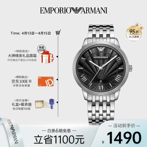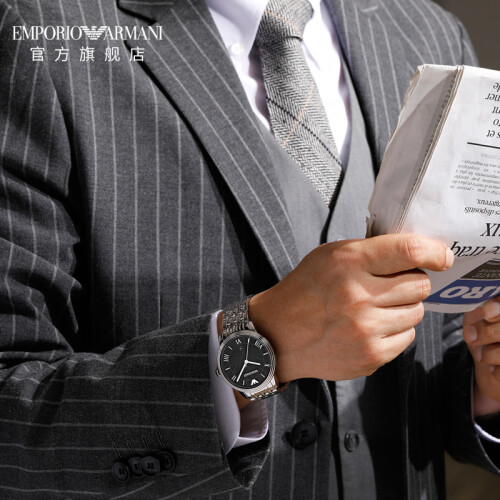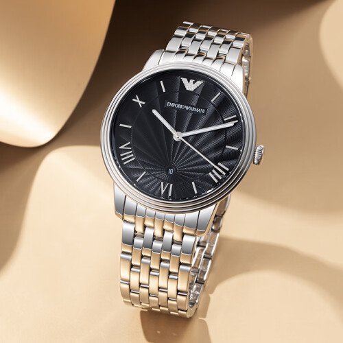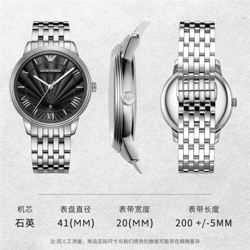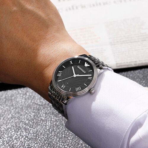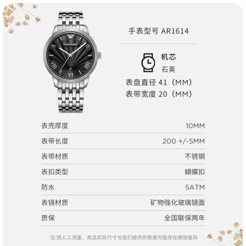 这款AR1614 男款石英表属于EMPORIO ARMANI睿智系列,配色经典大方,百搭实用,采用石英机芯,矿物质玻璃表镜,12点钟经典logo老鹰标志,6点位置设置精巧日期窗格,低调而实用,夜光指针,便于夜晚读时,表盘直径为41mm,表盘厚度为10mm,支持50米的生活防水。