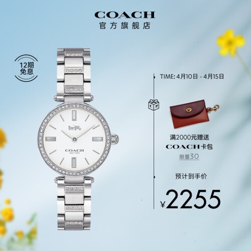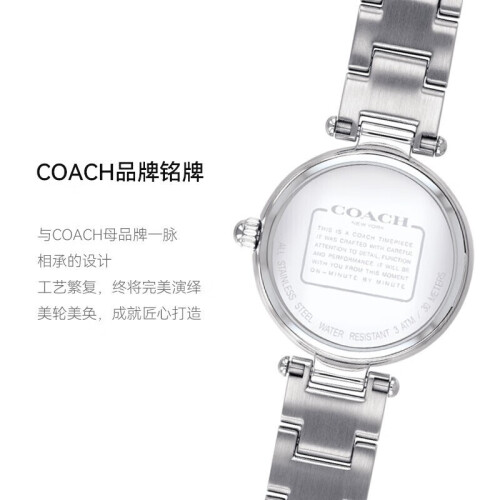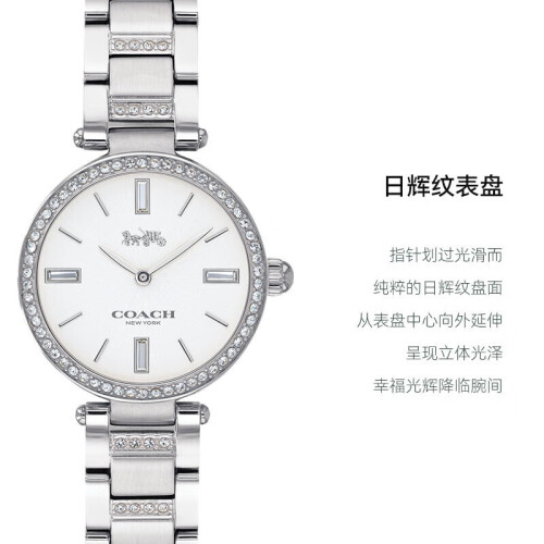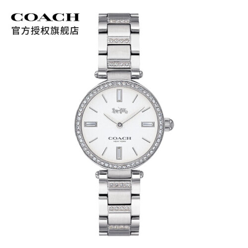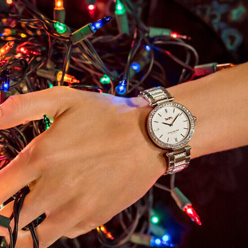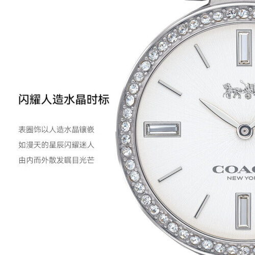 COACH 蔻驰 PARK系列 女士石英表 14503097,以纽约派克大街命名的PARK系列腕表,,将现代简约与精致瑰丽巧妙融合,展现都市女性多元的自信魅力。表镜采用矿物水晶表镜,通透度高,清晰透亮,无水纹及起泡,不易磨损刮花,搭配链式不锈钢表带,镶嵌小颗粒水晶,与表盘相互呼应,打造柔美气质。
