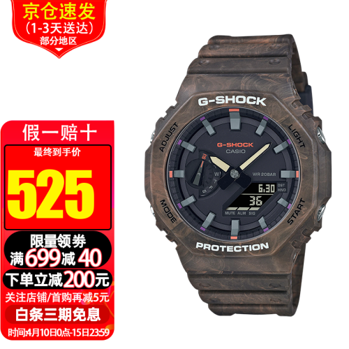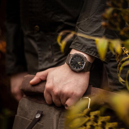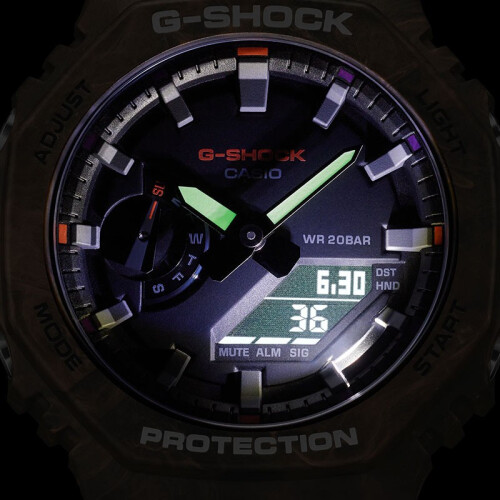 这款卡西欧 G-SHOCK系列型号为GA-2100,外观延续1983年发售的DW- 5000C经典DNA,释放年轻摩登的未来感。此外,GA- 2100系列选择了双显设计,矿物强化玻璃表镜,便于读时的同时又不失潮酷格调。融入碳纤维的精细树脂,将坚韧耐用与高刚性相融合,实现轻韧加持、耀目进化,不仅颜值出众,而且可靠实用,搭配石英机芯,表盘直径45.4mm,厚度仅为1 1.8mm,在保障了坚韧硬核性能的同时,更做到极简设计,也是目前G- SHOCK双显产品中较为轻薄的表款。支持200米防水,同时拥有全自动高亮度LED照明、全自动日历、世界时间、每日闹钟,整点提醒,防震、指针闪避以及倒计时等功能。