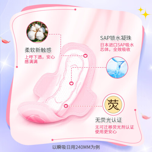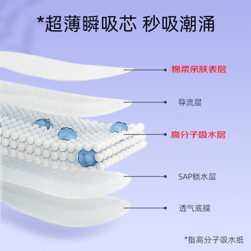 月月舒这款瞬吸透气清爽卫生巾,绵柔表层均匀分布透气速渗孔,加快经血下渗的同时亦可将粘稠状血块吸收。PE反渗漏底膜,清爽不闷热,搭配加宽护翼设计,集中吸收防侧漏,特殊时期依然轻松自在。