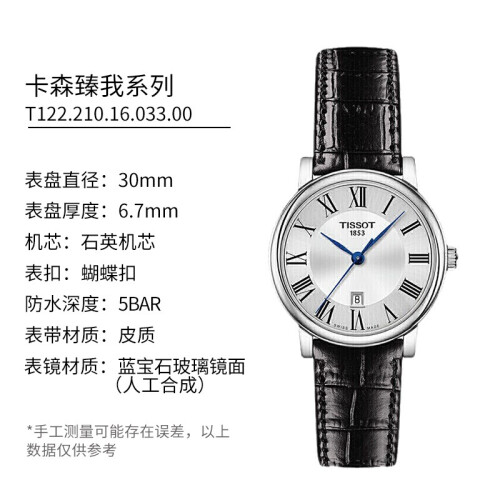 此款卡森臻我系列 T122.210.16.033.00 女表选用ETA 902.101石英机芯,人工合成蓝宝石玻璃表镜,素雅银色表盘搭配罗马数字刻度,展现复古风情,纤细黑色指针转动之间展现腕间典雅风情,皮质表带,触感温润,贴合人体,舒适佩戴,直径30MM,厚度6.15mm。