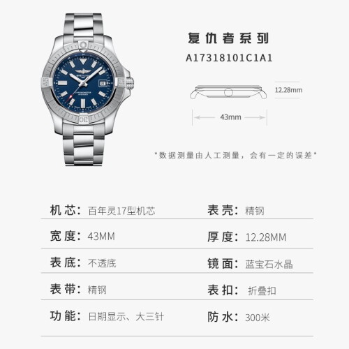 BREITLING 百年灵 复仇者系列 男士自动机械表 A17318101C1A1 日期显示、大三针功能,300米防水,自动机械机芯,动力储备40小时,防水深度300米,弧形蓝宝石,两面防眩光表镜。旋入式,双密封垫表冠。