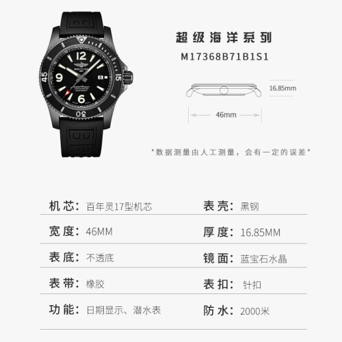 此款产品为BREITLING 百年灵 超级海洋系列 男士自动上链腕表 M17368B71B1S1,表壳采用类金刚石(DLC)涂层精钢,弧面蓝宝石表镜,双面防眩处理。Diver Pro III 深潜橡胶表带。瑞士天文台认证,动力储备40小时,防水深度2000米。