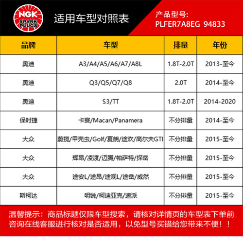 NGK是1946年创立的日本特殊陶业株式会社(总部位于日本名古屋)的简称。该公司分别于2001年在中国广州、2001年在苏州、2002年在上海设立了代表处,主要致力于火花塞、汽车尾气过滤器、氧传感器等产品的销售。2003年更是在上海设立了中国地区的第一家生产基地--上海特殊陶业有限公司,使得NGK在中国也能直接向各大用户提供世界最高水准的技术和服务。本款火花塞采用高科技电镀处理,不仅能承受高温,还能具有耐腐蚀效果,铜电极芯,有效提升火花塞的散热性能,预防发动机过热现象,使用特殊的镍合金中心和外侧点击,具有优良的耐热性与耐久性。火花塞的建议更换周期为2万公里/次,适用于骐达、蓝鸟、阳光、玛驰、轩逸、奇骏、逍客/启辰D50T70R50/风神A60/风度MX6等车型,