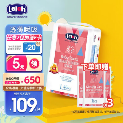 此款lelch 露安适 日夜透薄系列 婴儿拉拉裤 XL46片,采用0.18cm气垫蓬蓬芯,透薄瞬吸。创新“三明治结构”,更薄更能吸更透气。超强吸水疑珠,50倍吸收力,超强速吸MAX。