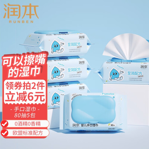 RUNBEN 润本 宝宝手口湿纸巾,采用水刺无纺布,含有木糖醇、金盏花、芦荟等提取物,温和不刺激 ,呈弱酸性,不含酒精、香料等成分,双层盖封设计,保湿时间长,不连抽,规格80片,共15包。