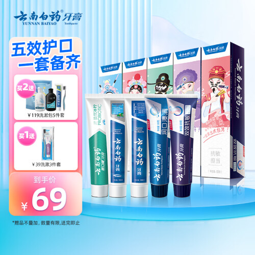 云南白药牙膏,含有特有的药物活性成分,能促进牙龈血液循环,长期使用可以防止牙龈出血,预防牙周炎、牙龈萎缩等口腔疾病。此套装包含留兰100g+冬青100g+双效抗敏100g+冰凝薄荷100g+润口渍清100g,共5支。