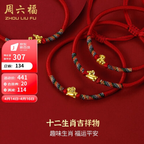 周六福 十二生肖5D硬金转运珠红绳手链 约0.3g,串珠以12生肖为设计元素,圆润饱满的形态,造型萌趣,搭配红绳,增添中式喜庆氛围。