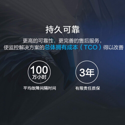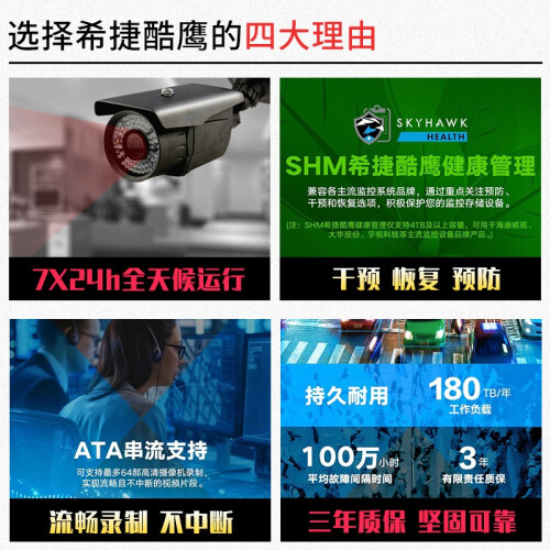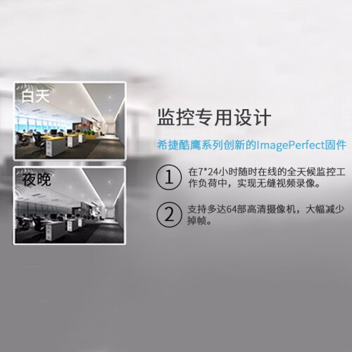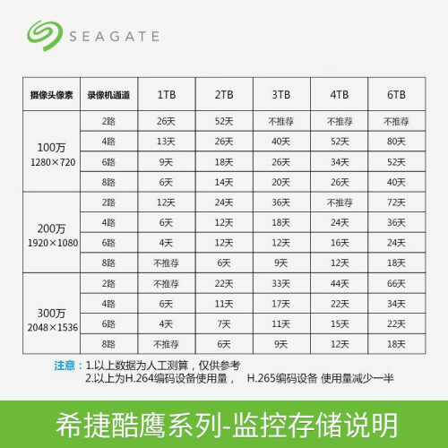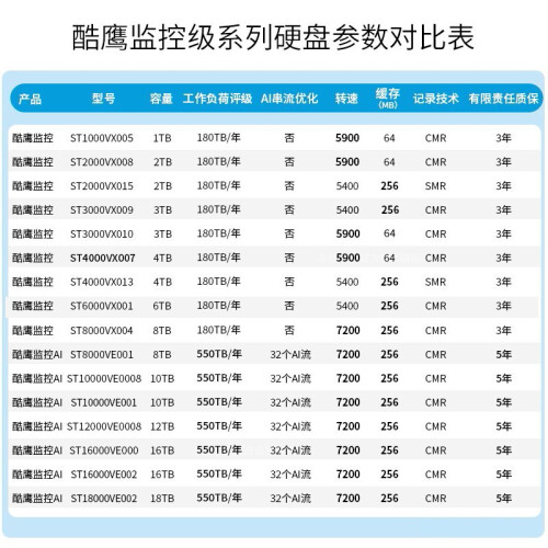 2016年希捷对旗下硬盘产品重新命名之后,监控级硬盘线被冠以“酷鹰”之名,对应从前的VX系列。新的酷鹰系列有1TB到10TB不同容量的多种版本,均为5900RPM转速,对于稳定可靠第一的视频监控来说,这个转速并不会拖后腿。相比台式机产品,监控级硬盘在设计时就考虑到了多盘工作方式、监控掉帧、多路并发等情形,并对此有专门优化,比直接使用台式机硬盘更可靠。另外,希捷还对酷鹰系列提供3年质保。