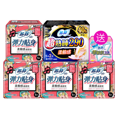 Sofy苏菲推出的这款卫生巾套装,包含日用款和夜用款。均选用棉柔表层,弹力合宜,触感柔软舒适。日用款厚度较薄,可保持肌肤清爽,方便日常活动。夜用款采用蝴蝶扇尾设计,可预防后漏。采用锁芯技术,量多也能快速吸收,并牢牢锁住。