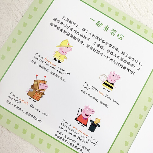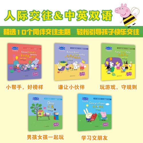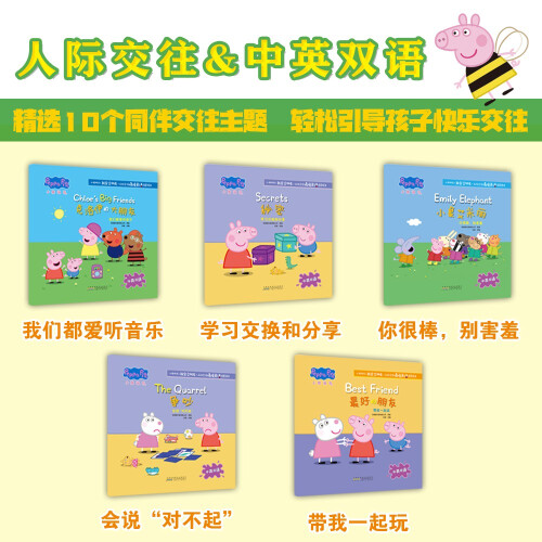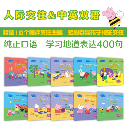 我会交朋友:人际交往情境英语启蒙绘本 是小猪佩奇系列动画的故事书,精选了10个生动有趣的幼儿社交小故事,分别设置了10个同伴交往的主题,能够培养孩子的社交能力,让孩子学会分享、尊重、谦让等美好品质,帮助孩子积极主动地交到更多好朋友。同时,采用中英文对照的形式,原汁原味地呈现游戏场景对话,潜移默化地提升孩子的英语水平,并配有纯正配音,帮助孩子掌握基本的社交英语。包含以下10册:《乔治的朋友》《克洛伊的大朋友》《小象埃德蒙的生日》《化妆派对》《秘密》《小兔理查德来玩》《小屋》《最好的朋友》《争吵》《小象艾米丽》。