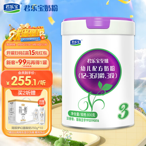 君乐宝成立于1995年,是河北省最大的乳制品加工企业,产品范围包括婴幼儿奶粉、低温酸奶、常温液态奶、牧业四大板块,其中婴幼儿奶粉在2014年正式开始生产,旗下有至臻、乐铂、恬适、乐纯、旗帜、乐臻、小小鲁班等系列,这款至臻A2系列主打的卖点是臻选仅约30%的A2纯合基因奶牛,并采用全球首家自有牧场、自有工厂的全产业链模式生产A2型奶牛奶粉,至臻A2富含亲和人体的A2-β酪蛋白,更容易被宝宝消化吸收,还创新添加了OPO+CPP,OPO更亲和、好吸收,CPP促进钙铁锌吸收,助力宝宝骨骼成长,配方中的DHA+ARA的组合可以帮助宝宝神经系统和眼脑发育。