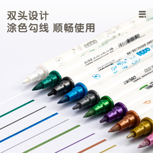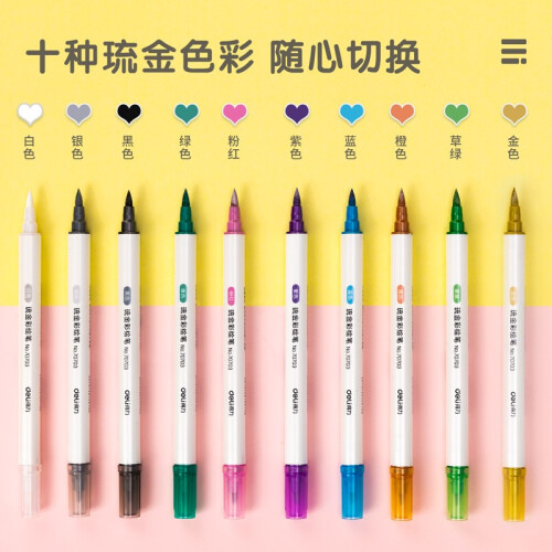 得力 DL-70704 双头鎏金彩笔 10色装,产品为10支1盒,共10种颜色,创作更出色。拥有双头设计,涂色勾线顺畅使用,软头使用轻松覆盖,标记醒目,适合大面积快速涂色,细头使用书写顺畅,多种色彩,适合勾线、手账。软头使用尼龙材质,细头采用纤维材质,耐磨耐用,带给你顺畅书写体验;可多表面书写,拥有不同的书写体验;多种书写形式,随心使用,制作手账多样色彩~