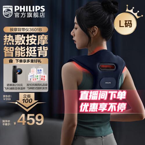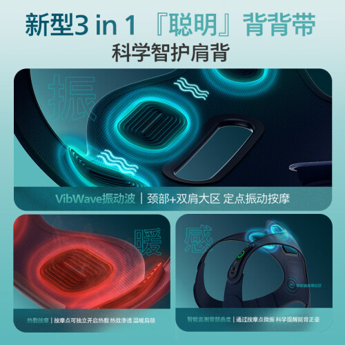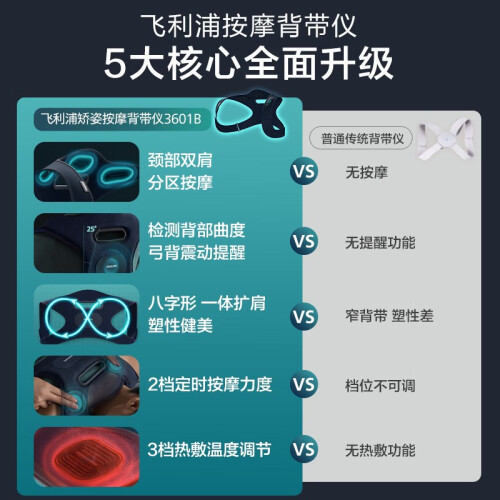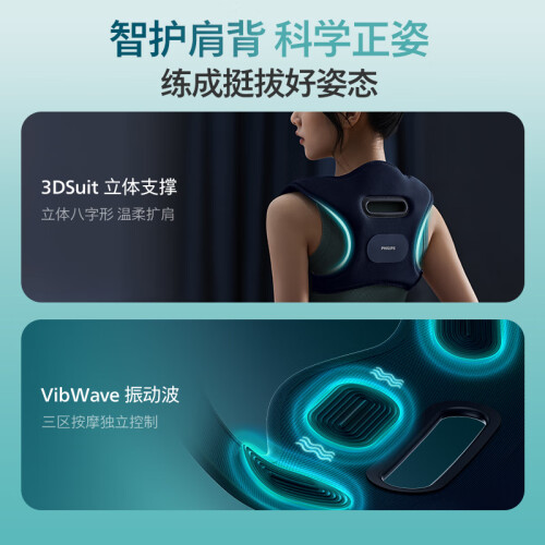 飞利浦 3601B 按摩器 集按摩、热敷、挺背于一体,智能呵护肩背贴身放松按摩,智能弓背提醒,让你轻松拥有挺拔好姿态。X型轻辅力温柔扩肩,8字形肩带与X型背部交叉立体设计,使肩部和腋下,向后拉伸,平衡肩背压力,助力开肩直背。