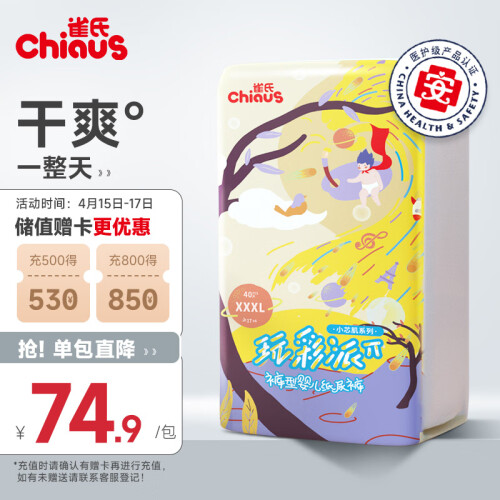 Chiaus 雀氏 小芯肌 婴儿学步裤 XL60片,采用弧形设计,舒适服帖,瞬吸芯体,快吸快干,贴心尿显设计,及时更换纸尿裤,双重防漏隔边设计,加大弹性。