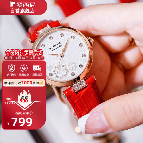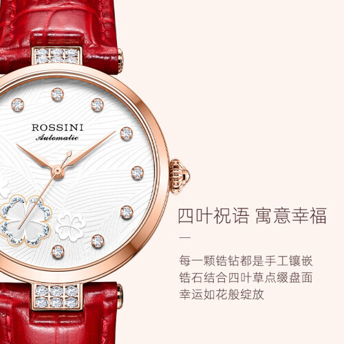 ROSSINI 罗西尼 典美系列 女士机械手表 516764G01C ,锆石点缀四叶纹,优雅如花般绽放,轻奢玫瑰金巧衬肤色,每一颗错钻都是手工镶嵌,时刻衬托好气色,360°璀璨动人。PVD电镀工艺,色泽持久魅力十足。人工蓝宝石玻璃表镜,进口机械机芯,表盘直径34mm,50米生活防水,满足日常防水需求,雨天也放心佩戴。