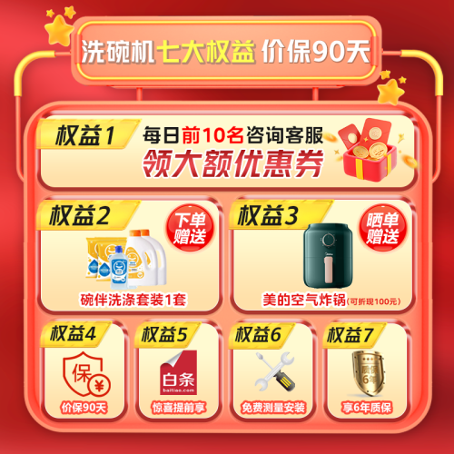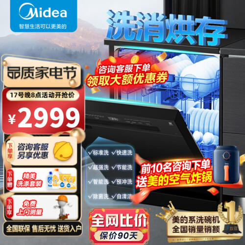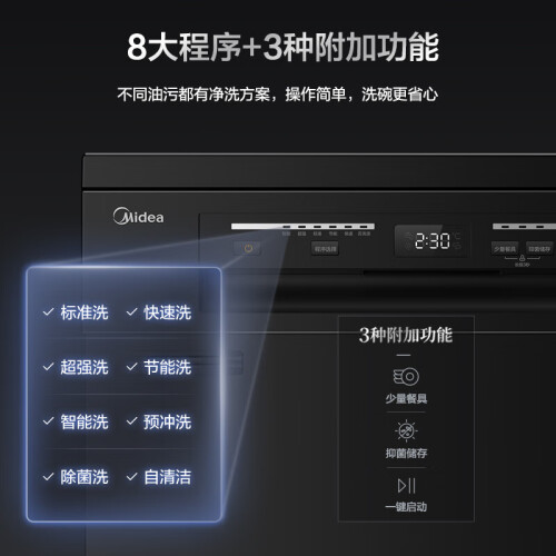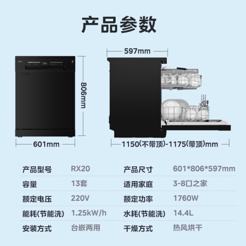 美的此款RX20洗碗机 容量为13套,安装高度为775mm,在不用大改橱柜的情况下,可以轻松嵌入常规800mm的中式橱柜里。采用双层中式碗篮,能够满足3~10口人家日常需求,一次最多可清洗3个锅具。洗涤方式为喷淋式,水压为15000Pa,支持72℃高温洗,采用360°自旋喷淋臂,洁净效果更出色。内置活水软化系统,能够减少水垢产生,避免餐具挂水渍。采用全新的热风循环烘干技术,内置PTC加热器,前面板配有出气口,在实现餐具和内胆全烘干的同时,避免返潮现象。内置8+3种洗涤程序,支持智能洗涤,可29分钟超快洗。支持72小时抑菌存储。可通过手机APP远程操控,实时监控洗涤状态。
