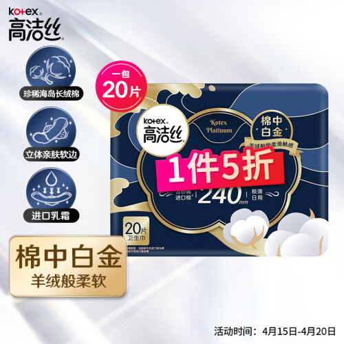 Kotex 高洁丝是Kimberly-Clark金佰利集团旗下的女性卫生用品品牌,产品包括纯棉卫生巾、超薄卫生巾、日用卫生巾、夜用卫生巾、迷你卫生巾、夜安裤、护垫等女性卫生巾产品。这款臻选系列卫生巾,采用澳洲进口棉花,0.08mm的吸收芯,吸收快无不适感,不含可迁移性荧光增白剂,不含重金属,使用更安心。