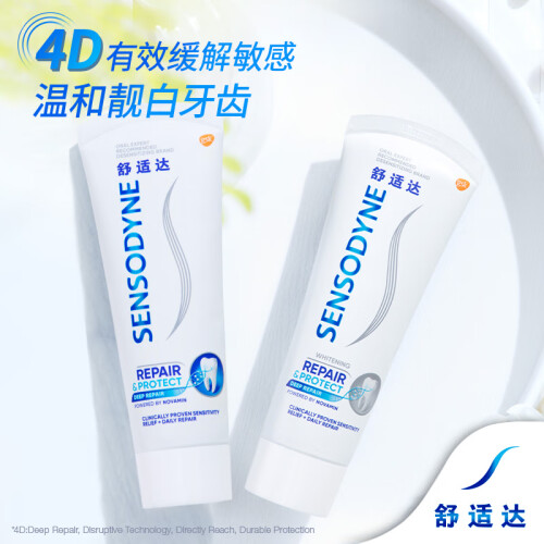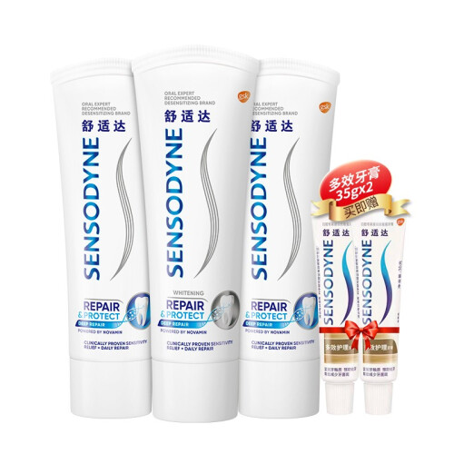 SENSODYNE舒适达为葛兰素史克旗下品牌,自1961年起始终致力于提供有效治疗牙本质敏感症状的方法,是专业的抗敏感牙膏品牌。和普通牙膏相比,舒适达牙膏用量很少却可以达到抗敏感的目的和效果,故定价较高。这款套装牙膏可有效缓解牙齿疼痛、抑制口腔细菌滋生、坚固牙釉质。 舒适达的成分主要有3种,分别是NovaMin诺华敏,修复作用,补充牙结构矿物质;乙酸锶,抗敏作用,速度高效;硝酸钾,抗敏修护美白,全面护理。今天推荐的是含有硝酸钾成分,能缓解冷热对牙齿神经的刺激,并且具有一定的美白功能。