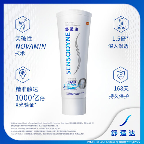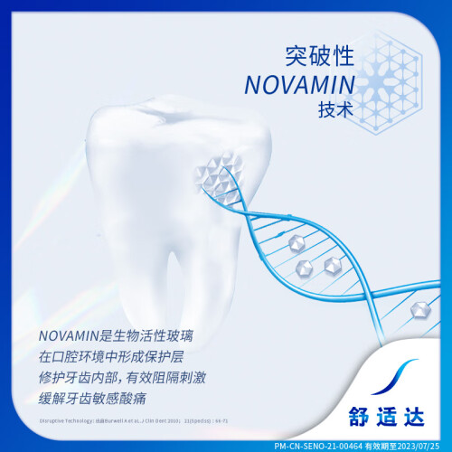 葛兰素史克旗下品牌SENSODYNE舒适达的牙膏有口皆碑,是专业的抗敏感牙膏品牌,受到很多牙医的推崇。这款舒适达专业修复牙膏,采用NovaMin®专利科技,遇到唾液能释放出钙和磷酸盐,在牙本质上形成修复层,有益于修复敏感牙齿受损部位,帮助预防牙齿敏感疼痛 。