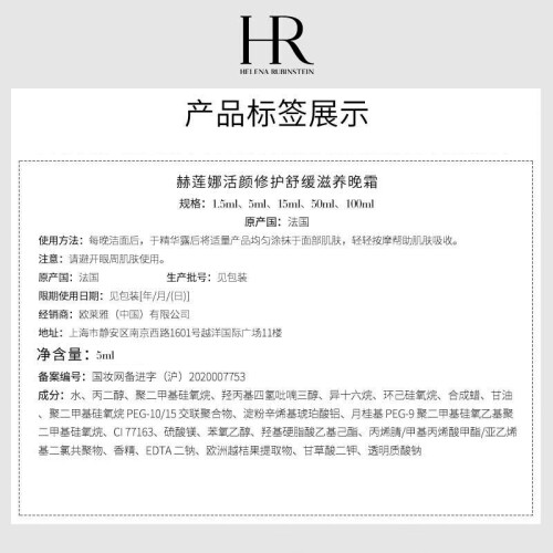 HR 赫莲娜(Helena Rubinstein) 于1902年由赫莲娜·鲁宾斯坦女士 (Helena Rubinstein) 创立,于1988年被欧莱雅集团收购,是欧莱雅集团旗下的*级奢华美容品牌,明星产品包括绿宝瓶系列,至美溯颜系列,和干预式护肤系列等。