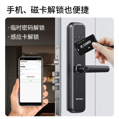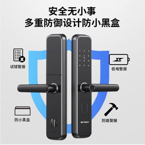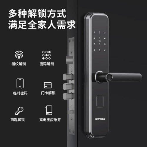 全钢锁体,C级锁芯,防盗防撬警报,霸王锁体,支持指纹,刷卡,密码开锁,微信生成零时密码,客人到访以及家政服务无需等待。内置超大门铃,声音清晰使用方便,半导体指纹,自动检测活体指纹,假指纹无效。指纹验证后下压把手开门,关门上提把手反锁,出门更安心,开关门更安静,深夜回家也不打扰家人休息。