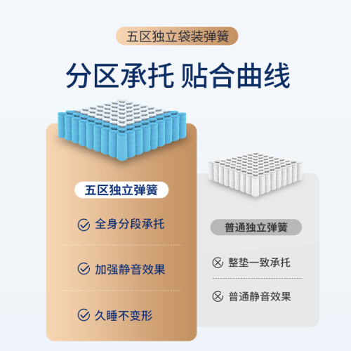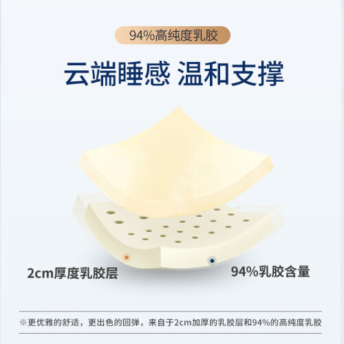 乳胶与黄麻分布在五区弹簧的两面,以实现双面睡的功能。因人的不同阶段对床垫软硬的需求不同,双面设计更适合大多数人的睡眠喜好。乳胶的纯度决定了它的支撑性,来自优质原产地的94%高纯度的乳胶弹力舒释感更强烈,同时2CM加厚乳胶层,更提升床垫的承托性能。