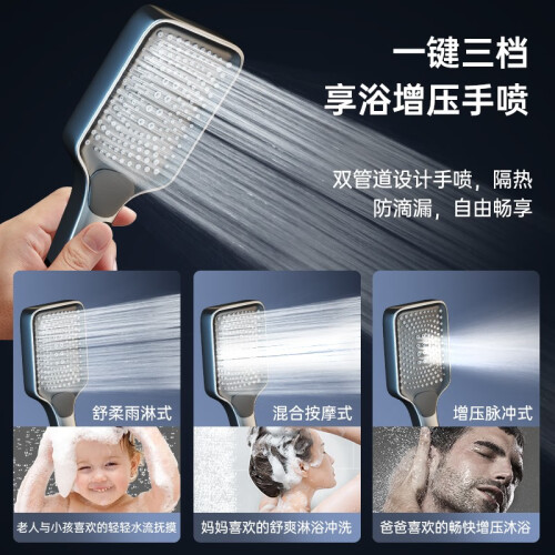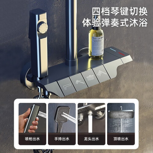 结合现代美学,打造与众不同的创新花洒,典雅枪灰拉丝工艺,铸就新格调,钢琴按键让带给您全新体验。高附着防绣烤漆工艺,高硬度,抗划痕,耐磨,经多层工序精研打造,成就高级质感。宽大顶喷使出水大范围淋浴全身,出水效果宛如天然淋浴,仿若享受身心舒适SPA,洗去一天的疲惫。