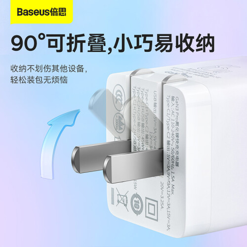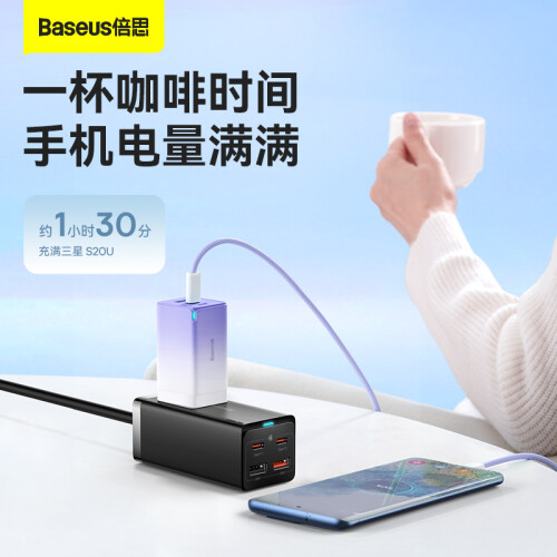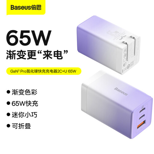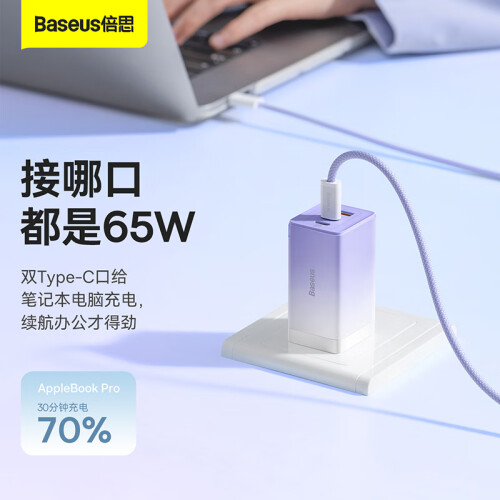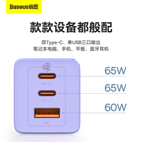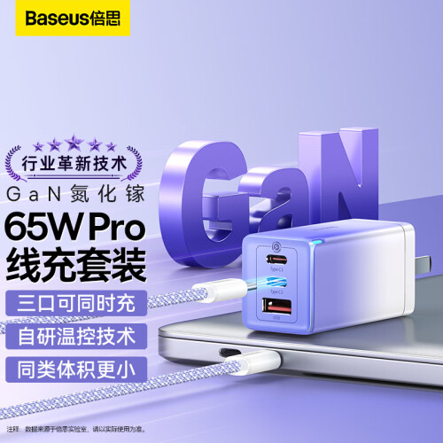 倍思(Baseus)这款氮化镓充电器套装,充电头搭载倍思自研BPS II充电技术,实现65W双口盲插,功率大,体积小;采用BCT纳米技术,激发散热表面的红外共振效应,加快热量从散热表面散发,提高散热效率;1个共享3台设备,平板、手机、移动电源可同时充电。标配数据线支持5A电流,可耐90°弯折。