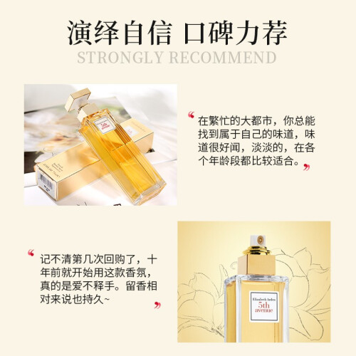 Elizabeth Arden伊丽莎白·雅顿是美国知名的化妆品品牌,第五大道是口碑较好的一款淡香水,有如纽约第五大道似的摩登,凸显时尚都市风格。选用保加利亚玫瑰、紫罗兰、桃花、鸢尾花等香氛,香气柔和适中,展现女性自信的一面,瓶身设计简洁利落,以纽约曼哈顿的摩天大楼为瓶侧的线条,颇具现代节奏感,规格30ml。
