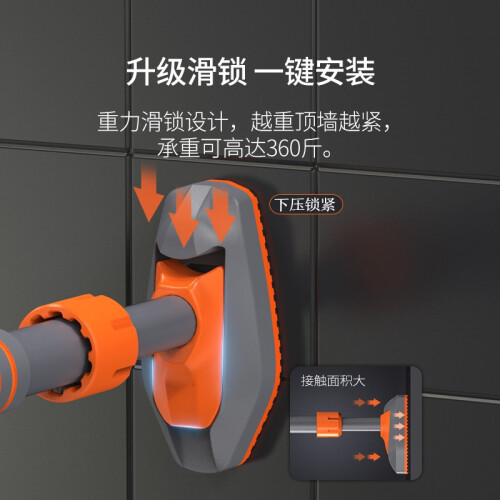 重力滑锁设计,越重顶墙越紧,承重可高达360斤。凹凸防滑纹理防滑条,接触面积大,更牢固更放心。升级加厚泡棉,触感柔软不易起茧。榫卯齿轮锁扣加强保护,提高安全稳固性,防止旋转松动。