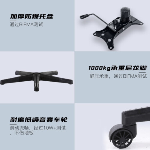 采用科技布面料,防污防水透气性好耐刮划。弹簧坐垫,坐感舒适 。全钢制骨架以及尼龙五爪,可承受1000KG 。SGS4级气杆+加厚托盘,全方位保障安全。