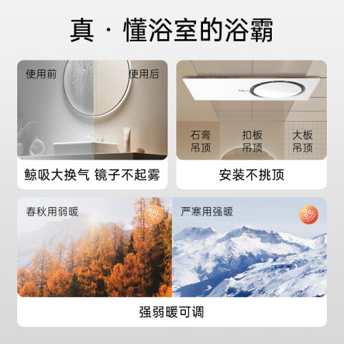360°悬浮结构进气,飓风反向增压,实现250m3/h鲸吸换气量,是普通浴霸的2倍,可瞬间带走浴室闷臭异味,清新空气。