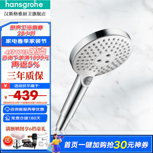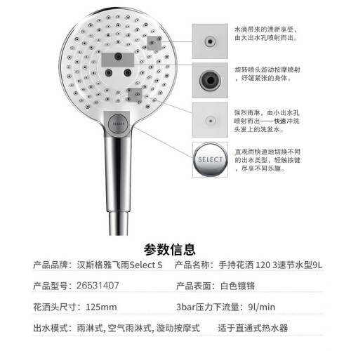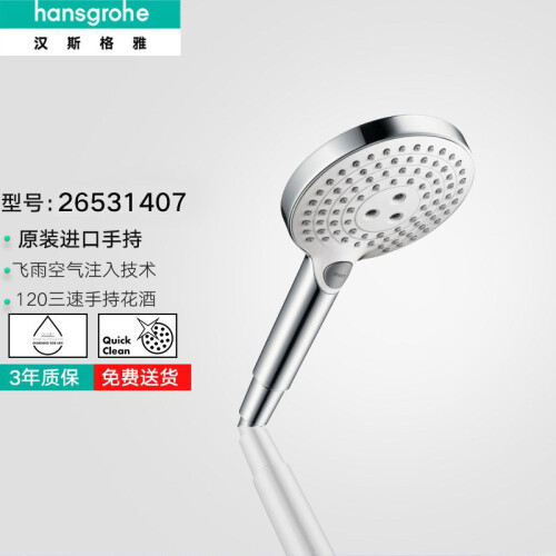 Hansgrohe汉斯格雅于1901年在德国成立,是一个专业的卫浴产品制造商,经过百年的发展,在业内居于领导地位。因其优秀的设计以及品质,在众多星级酒店中均有配备,此款更适合想花低价体验德国品质的同学。 这款Select E120三速手持花洒,带有水柱、淋雨、空气淋雨三种模式可调节,通过花洒上的按键调节以满足各种不同的使用需求。此外品牌特有的Air Power空气注入技术,能够为使用者带来更加舒适地沐浴体验;Quickclean快速清洁功能,通过按压外部的弹性硅胶即可实现,能够轻松去除水垢,另水流均匀并且延长使用寿命。