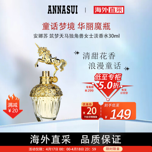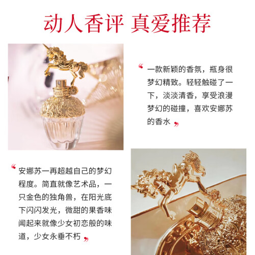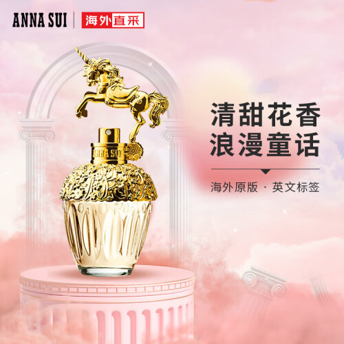 安娜苏(ANNA SUI)推出的这款筑梦天马女士淡香水,外形采用波浪型多面玻璃,瓶盖上雕刻着金色的叶子与花朵。顶端装饰着天马,按喷时会旋动,华丽又梦幻。香水为花果木质香调,香味清新柔媚,蕴含神秘与性感。 前调:粉红柚子 黑加仑子 粉红胡椒 中调:紫罗兰 橙花 粉彩兰花 树莓果仁糖 后调:黄金柏树 喜马拉雅雪松木
