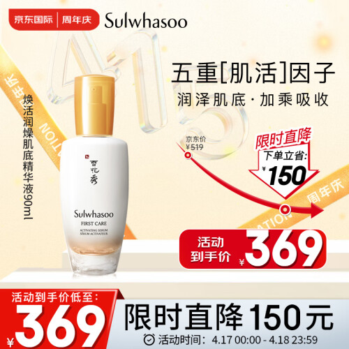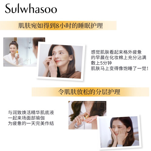 这款Sulwhasoo 雪花秀 润致焕活精华肌底液 是一款著名的润燥精华,富有滋盈肌活因子,使肌肤滋盈水润,补水保湿;具有雪花秀生物技术,可以修护润泽肌底,提升屏障肌能,帮助肌肤稳定平衡;作为一款导入精华,需在化妆水之前使用。主要功效除了能加快后续产品的吸收以外,也具备最佳的保湿功能;能提升肌肤的修护力,适合换季时肌肤肤质改变的条件下使用,质地清爽,可深度滋养肌肤,令肌肤达到平衡状态,加速保养品吸收。规格:90ml。