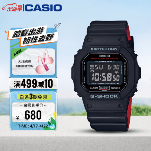 CASIO 卡西欧 G-SHOCK 的5600系列虽然没有光动能或者电波对时,却被国内外玩家推崇,奉为经典之作。这款G-SHOCK系列DW-5600E-1V 男表采用石英机芯,矿物强化玻璃表镜,清晰耐刮,经典方块表盘,阿拉伯时标数显,同时拥有电子荧光照明,防震,多功能闹铃,全自动日历,倒计时等功能,简单大方的设计,抗震耐摔的特质,突破传统的防震结构,有效缓冲外力的冲击,树脂表带佩戴舒适,表盘直径38mm 厚度11mm,200米防水