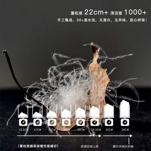 选用优质散养皖西大白鹅绒(绒子含量95%),提取腹部精华的羽绒制作而成,绒朵大,弹性高,使用寿命久,保暖性好。采用33道水洗工序,1000+高清洁度,洁净无异味。出口日本、TTC静音面料由交织而成,触感轻柔,静音, 感受酒店般安静睡眠。