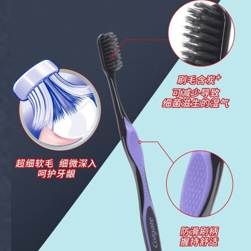 本款牙刷为高露洁生产,采用进口超细软毛,能够温和深入清洁牙缝,牙刷背部带有舌苔清洁纹路,方便清洁口腔内壁及舌头;刷柄带有防滑软胶,握感舒适,不滑手且方便操控。